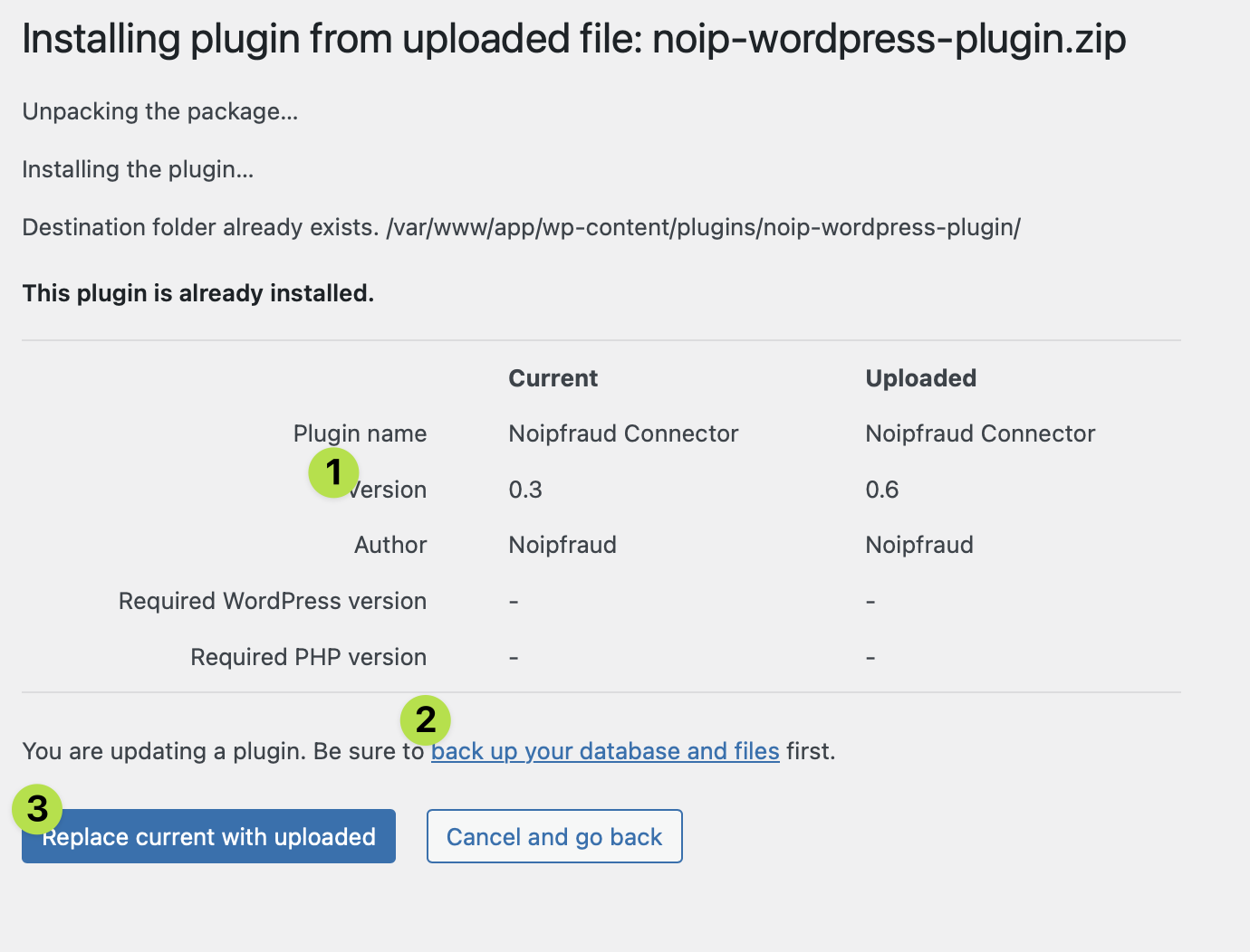 You will now be asked to replace your old version of the plugin. Just double check the versions, make a backup  if you prefer, and click "Replace"&#x20;